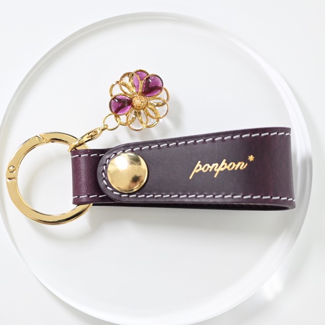 本革×オリジナル刻印|ponpon*レザーキーホルダー 取り外し可能なmini blossom着せ替えチャーム付き ⸻ 大切な鍵と、毎日を一緒に。 ponpon*オリジナル刻印入り、本革レザーキーホルダーです。 選び抜いた素材は、イタリア製の高級レザー「ブッテーロ」。 使うほどに艶が増し、経年変化を楽しめるのが魅力です。 本革ならではのしっとりとした手触りと、発色の美しさは、 毎日手に取るたびに気分を上げてくれます。 アクセントには、ブランドのシンボル「mini blossom」チャームを。 大人可愛いワンポイントとして、ギフトにもぴったりです。 ▶ポイント • イタリア製ブッテーロレザー使用 • オリジナルデザイン&刻印 • 国産金具&スナップボタン仕様で着脱スムーズ • 経年変化で味わいが増す • スナップボタンつきでベルト、カチューシャ、キャップにも取り付け可能 サイズ レザー本体〜カラビナまで全て含んだ部分:縦10.6cm 横2.8cm mini blossomとカニカンまで全て含んだ部分:縦4.2cm、横2.1cm 素材:牛革(ブッテーロ)/金具(国産)/チャーム(レジン) 生産国:日本(職人による手作業) ┈┈┈┈┈┈┈┈┈┈ 取り扱いにあたっての注意事項 ※当製品に使用している「ブッテーロレザー」は、イタリア・ワルピエ社による 植物タンニン鞣しの上質な牛革です。 天然素材ならではの風合いや経年変化をお楽しみいただける一方で以下の点にご留意ください。 色ムラ・シワ・血筋などの個体差がございますが、天然皮革の証であり品質に問題はございません。 顔料を含むアイスブルーは他の色に比べ少しシワが目立ちますが、品質に問題はございません。 摩擦や水濡れにより色落ち・色移りが生じることがありますので雨の日はご注意ください。 特に淡色の衣類やバッグ等との組み合わせにはご注意ください。 爪傷や擦れ傷が付きやすい性質がありますが、使用とともにツヤが増し、味わい深い表情へと変化します。 傷がついた場合、直ぐに柔らかい布で擦ってあげると馴染みます。 保管の際は、直射日光や高温多湿を避け、風通しの良い場所で保管してください。 天然素材ならではの“育てる楽しみ”を、 ぜひponpon*のキーホルダーでご体感ください。